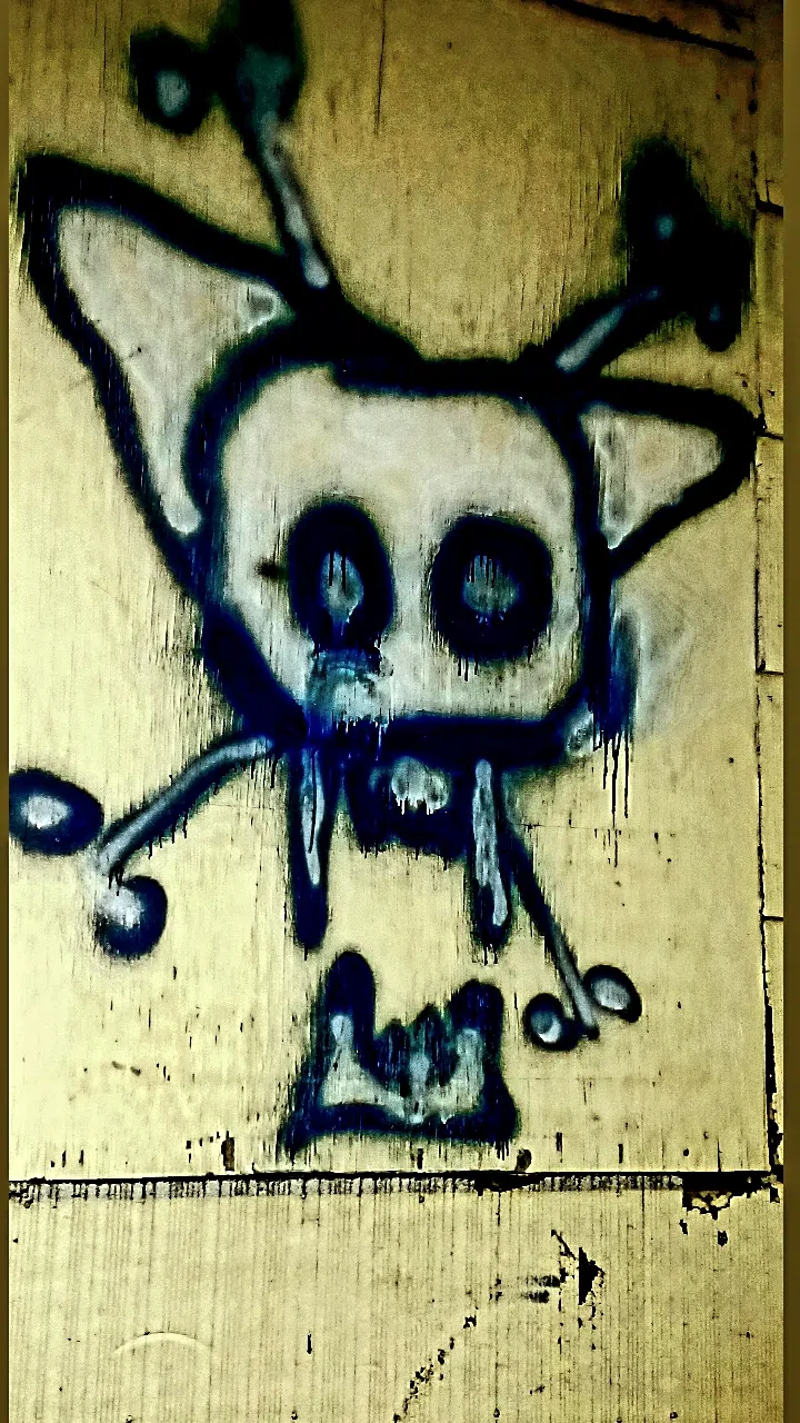 Lost Cat spray painted in blue Skull and cross bones Lost Cat Near rr tracks Rear outside wall of Rick's Rentals