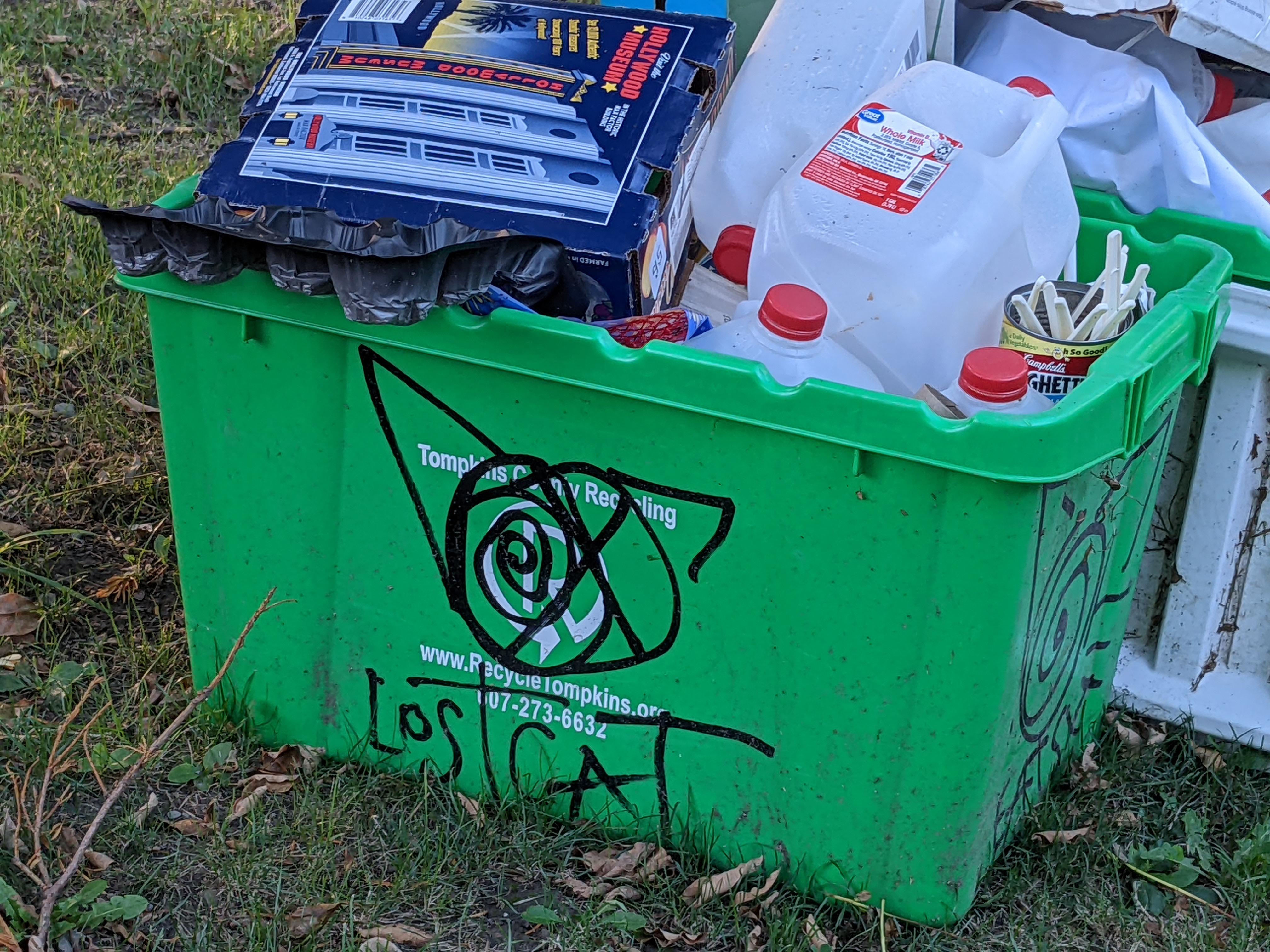 A lost cat found a home on this recycling bin. Also an eat shit graffiti is here. Same person?? #Catquest ⚔️
