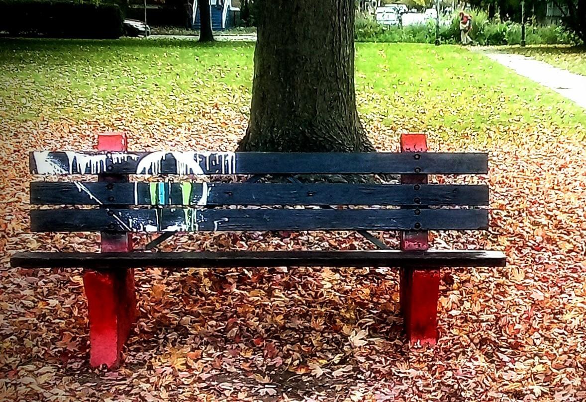 A red and black park bench with a resolute opinion END R A C I S M ! Cat thinking : what is taking you stupid humans so long to learn how to do this