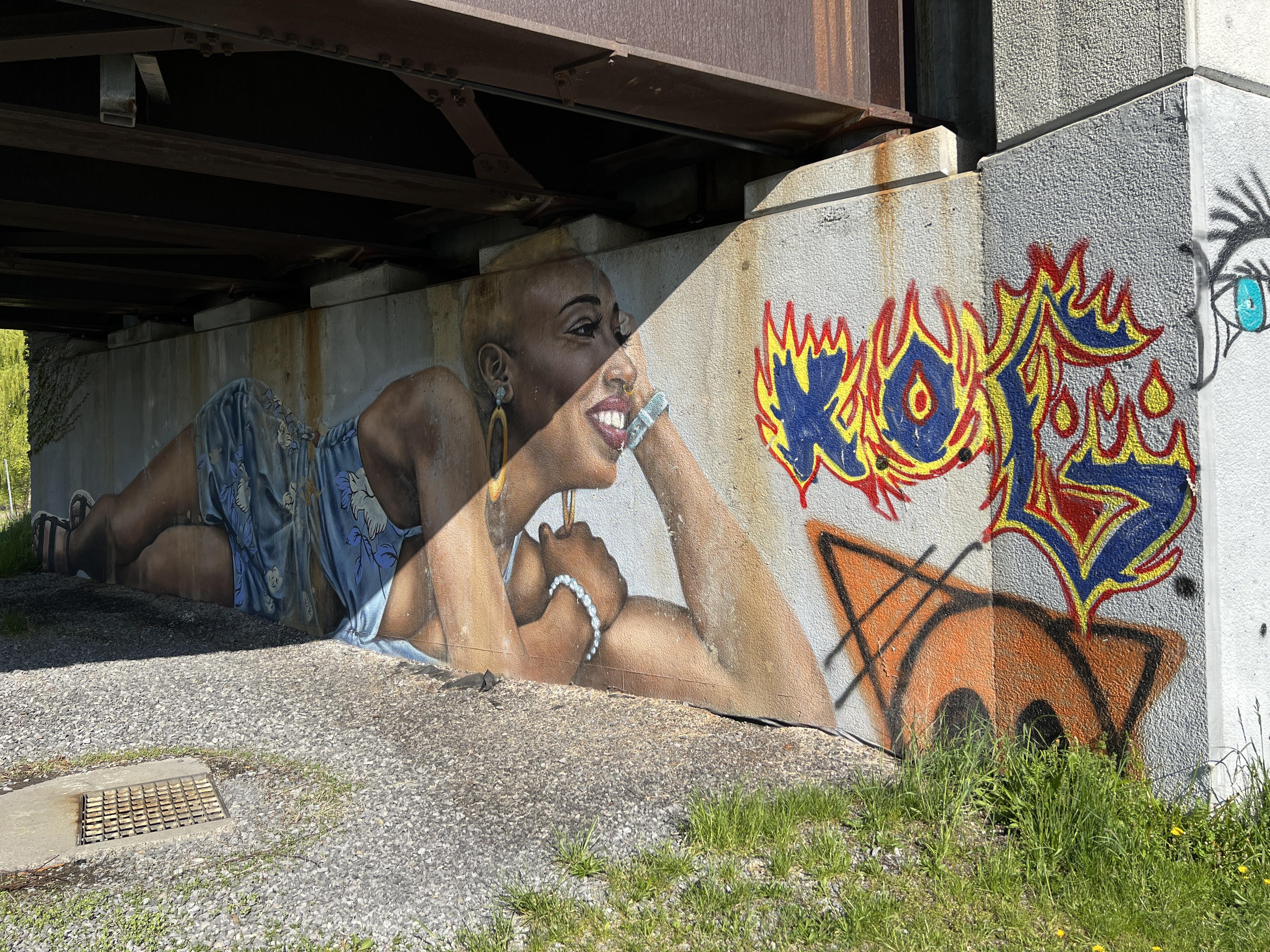 Filled in with orange; adjacent to the large-scale mural under the bridge